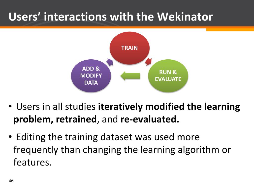Users’ interactions with the Wekinator • Users in all studies iteratively modified the learning problem, retrained, and re-evaluated. • Editing the training dataset was used more frequently than changing the learning algorithm or features.