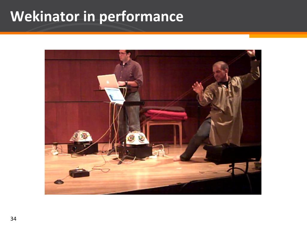 Study 2: Teaching interactive systems building in an undergraduate course • COS/MUS 314 Spring 2010 (PLOrk) • Focus on building interactive music systems • Method: • Wekinator midterm assignment • 1 continuous + 1 discrete system • Limited choice of controller + synthesis, balanced task order • Logging + questionnaire data • Observations of midterm and final performances • Outcomes: • Successful project completion • Logs from 21 students