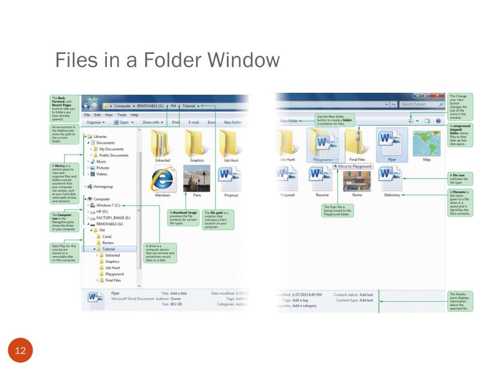 Exploring Files, Folders, and Libraries • Windows Explorer and the Computer window show the drives, folders, and files on your computer • Each has a slightly different view • A folder window displays the files and subfolders in a folder • Divided into two sections, called panes
