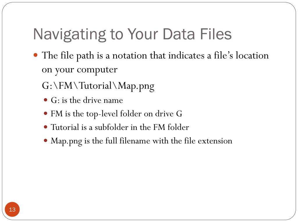 Navigating to Your Data Files • The file path is a notation that indicates a file’s location on your computer G:\FM\Tutorial\Map.png • G: is the drive name • FM is the top-level folder on drive G • Tutorial is a subfolder in the FM folder • Map.png is the full filename with the file extension