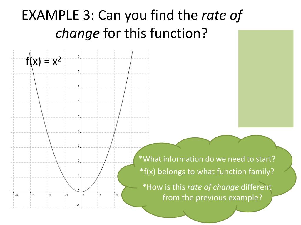 EXAMPLE 3: Can you find the rate of change for this function? f(x) = x2 *What information do we need to start? *f(x) belongs to what function family? *How is this rate of change different from the previous example?