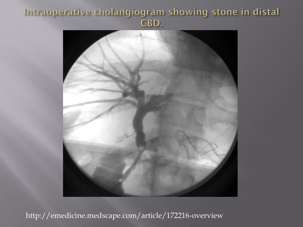 Intraoperative cholangiogram showing stone in distal CBD. http://emedicine.medscape.com/article/172216-overview