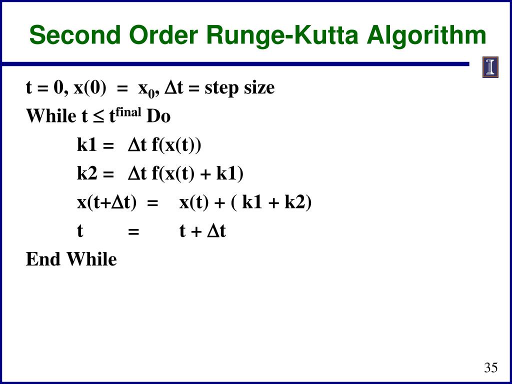 Second Order Runge-Kutta Algorithm t = 0, x(0) = x0, Dt = step size While t tfinal Do k1 =Dt f(x(t)) k2 =Dt f(x(t) + k1) x(t+Dt) = x(t) + ( k1 + k2) t = t + Dt End While
