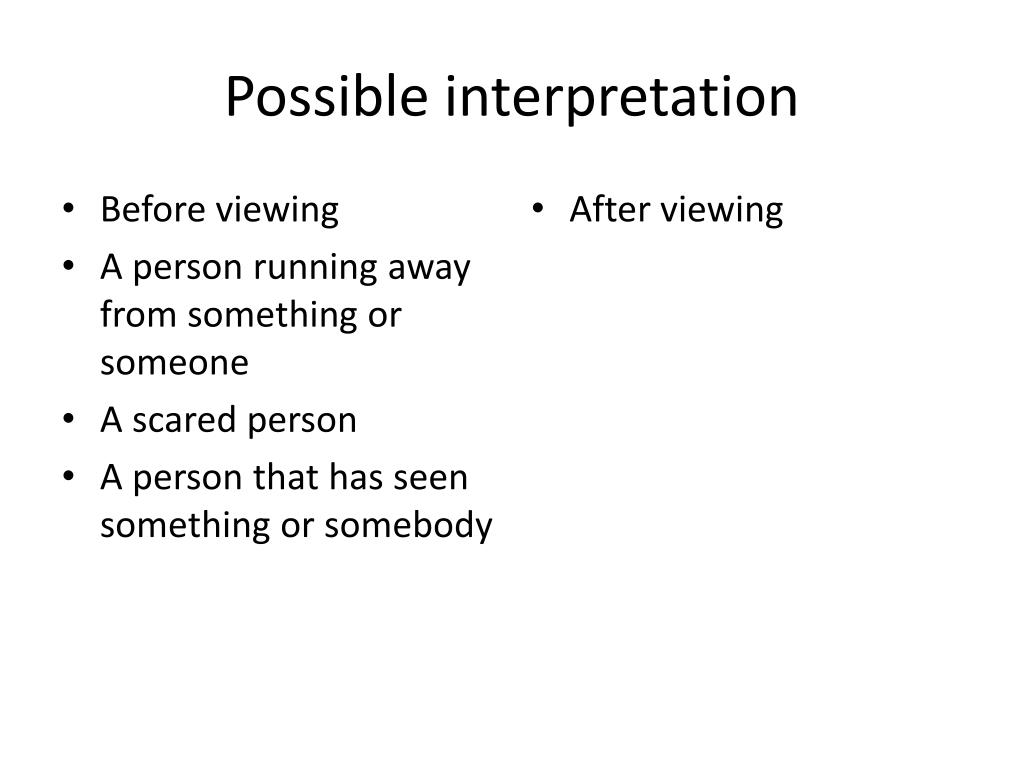 Possible interpretation • Before viewing • A person running away from something or someone • A scared person • A person that has seen something or somebody • After viewing