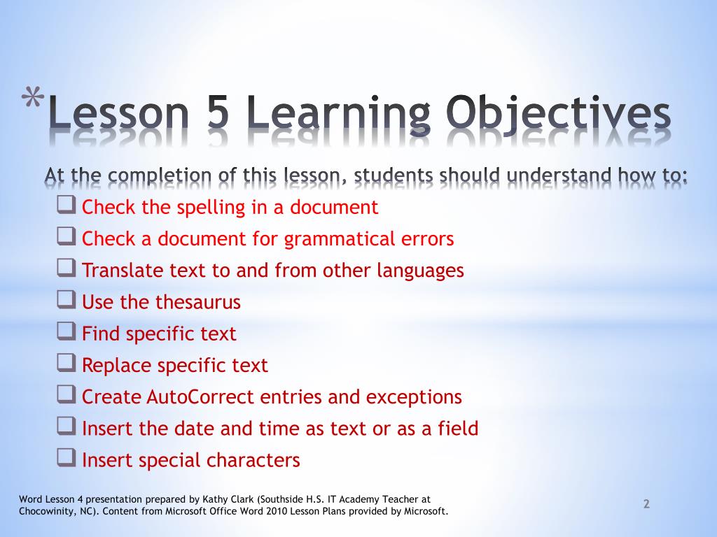 Lesson 5 Learning ObjectivesAt the completion of this lesson, students should understand how to: Check the spelling in a document Check a document for grammatical errors Translate text to and from other languages Use the thesaurus Find specific text Replace specific text Create AutoCorrect entries and exceptions Insert the date and time as text or as a field Insert special characters Word Lesson 4 presentation prepared by Kathy Clark (Southside H.S. IT Academy Teacher at Chocowinity, NC). Content from Microsoft Office Word 2010 Lesson Plans provided by Microsoft.