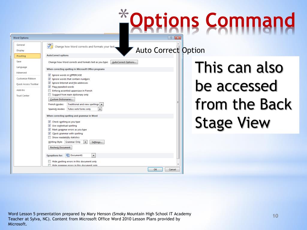 Auto Correct Option This can also be accessed from the Back Stage View Options Command Word Lesson 5 presentation prepared by Mary Henson (Smoky Mountain High School IT Academy Teacher at Sylva, NC). Content from Microsoft Office Word 2010 Lesson Plans provided by Microsoft.