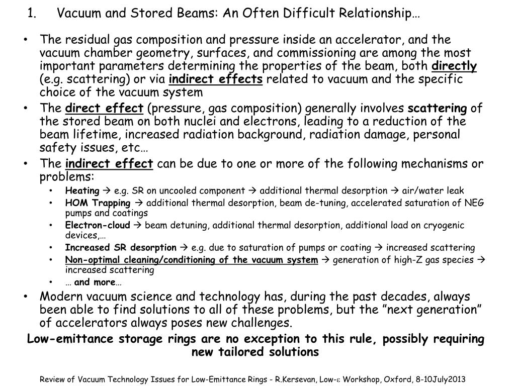 The residual gas composition and pressure inside an accelerator, and the vacuum chamber geometry, surfaces, and commissioning are among the most important parameters determining the properties of the beam, both directly (e.g. scattering) or via indirect effects related to vacuum and the specific choice of the vacuum system The direct effect (pressure, gas composition) generally involves scattering of the stored beam on both nuclei and electrons, leading to a reduction of the beam lifetime, increased radiation background, radiation damage, personal safety issues, etc… The indirect effect can be due to one or more of the following mechanisms or problems: Heating e.g. SR on uncooled component additional thermal desorption air/water leak HOM Trapping additional thermal desorption, beam de-tuning, accelerated saturation of NEG pumps and coatings Electron-cloud beam detuning, additional thermal desorption, additional load on cryogenic devices,… Increased SR desorption e.g. due to saturation of pumps or coating increased scattering Non-optimal cleaning/conditioning of the vacuum system generation of high-Z gas species increased scattering … and more… Modern vacuum science and technology has, during the past decades, always been able to find solutions to all of these problems, but the ”next generation” of accelerators always poses new challenges. Low-emittance storage rings are no exception to this rule, possibly requiring new tailored solutions Review of Vacuum Technology Issues for Low-Emittance Rings - R.Kersevan, Low-e Workshop, Oxford, 8-10July2013 Vacuum and Stored Beams: An Often Difficult Relationship…