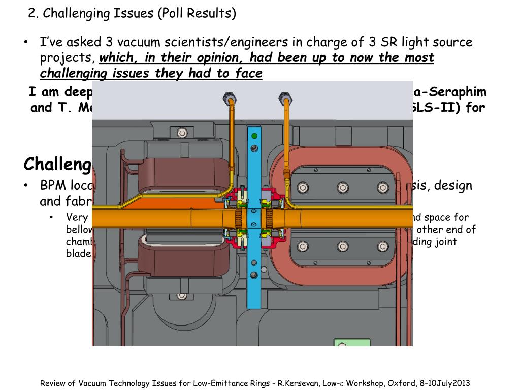 I’ve asked 3 vacuum scientists/engineers in charge of 3 SR light source projects, which, in their opinion, had been up to now the most challenging issues they had to face I am deeply indebted with E. Al-Dmour (MAX-IV), R. Molina-Seraphim and T. Mendes da Rocha (SIRIUS), and H.(Dick) Hseuh (NSLS-II) for sharing with me their experiences Challenges: BPM location within the cells and BPM block/electrodes analysis, design and fabrication Very little space left for stand alone BPM units: extremely difficult to find space for bellows on both sides. Result is one bellow is on BPM block, the other is at other end of chamber welded onto BPM block. Danger of breaking the delicate BeCu sliding joint blade/fingers Review of Vacuum Technology Issues for Low-Emittance Rings- R.Kersevan, Low-e Workshop, Oxford, 8-10July2013 2. Challenging Issues (Poll Results)