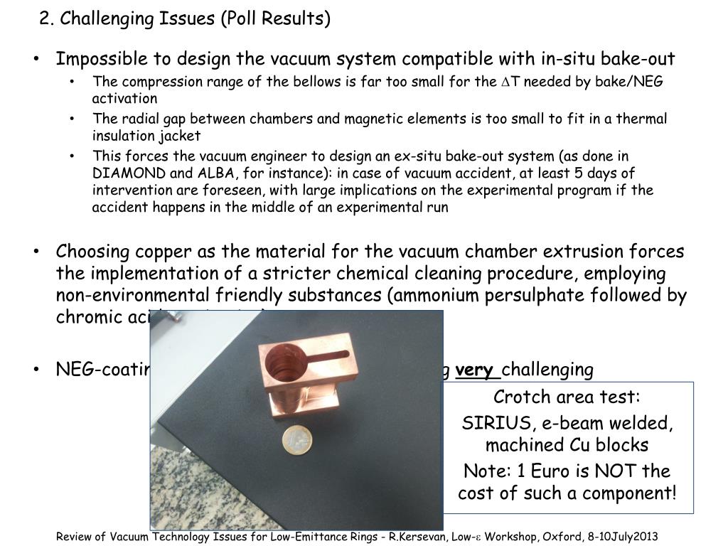 Impossible to design the vacuum system compatible with in-situ bake-out The compression range of the bellows is far too small for the DT needed by bake/NEG activation The radial gap between chambers and magnetic elements is too small to fit in a thermal insulation jacket This forces the vacuum engineer to design an ex-situ bake-out system (as done in DIAMOND and ALBA, for instance): in case of vacuum accident, at least 5 days of intervention are foreseen, with large implications on the experimental program if the accident happens in the middle of an experimental run Choosing copper as the material for the vacuum chamber extrusion forces the implementation of a stricter chemical cleaning procedure, employing non-environmental friendly substances (ammonium persulphate followed by chromic acid passivation) NEG-coating of narrow crotch areas is proving very challenging Review of Vacuum Technology Issues for Low-Emittance Rings- R.Kersevan, Low-e Workshop, Oxford, 8-10July2013 2. Challenging Issues (Poll Results) Crotch area test: SIRIUS, e-beam welded, machined Cu blocks Note: 1 Euro is NOT the cost of such a component!