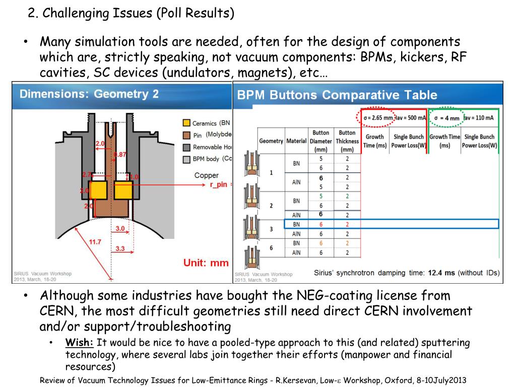 Many simulation tools are needed, often for the design of components which are, strictly speaking, not vacuum components: BPMs, kickers, RF cavities, SC devices (undulators, magnets), etc… Although some industries have bought the NEG-coating license from CERN, the most difficult geometries still need direct CERN involvement and/or support/troubleshooting Wish: It would be nice to have a pooled-type approach to this (and related) sputtering technology, where several labs join together their efforts (manpower and financial resources) Review of Vacuum Technology Issues for Low-Emittance Rings- R.Kersevan, Low-e Workshop, Oxford, 8-10July2013 2. Challenging Issues (Poll Results)