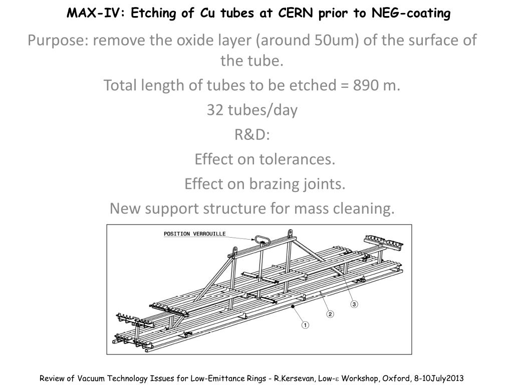 Purpose: remove the oxide layer (around 50um) of the surface of the tube. Total length of tubes to be etched = 890 m. 32 tubes/day R&D: Effect on tolerances. Effect on brazing joints. New support structure for mass cleaning. Review of Vacuum Technology Issues for Low-Emittance Rings- R.Kersevan, Low-e Workshop, Oxford, 8-10July2013 MAX-IV: Etching of Cu tubes at CERN prior to NEG-coating