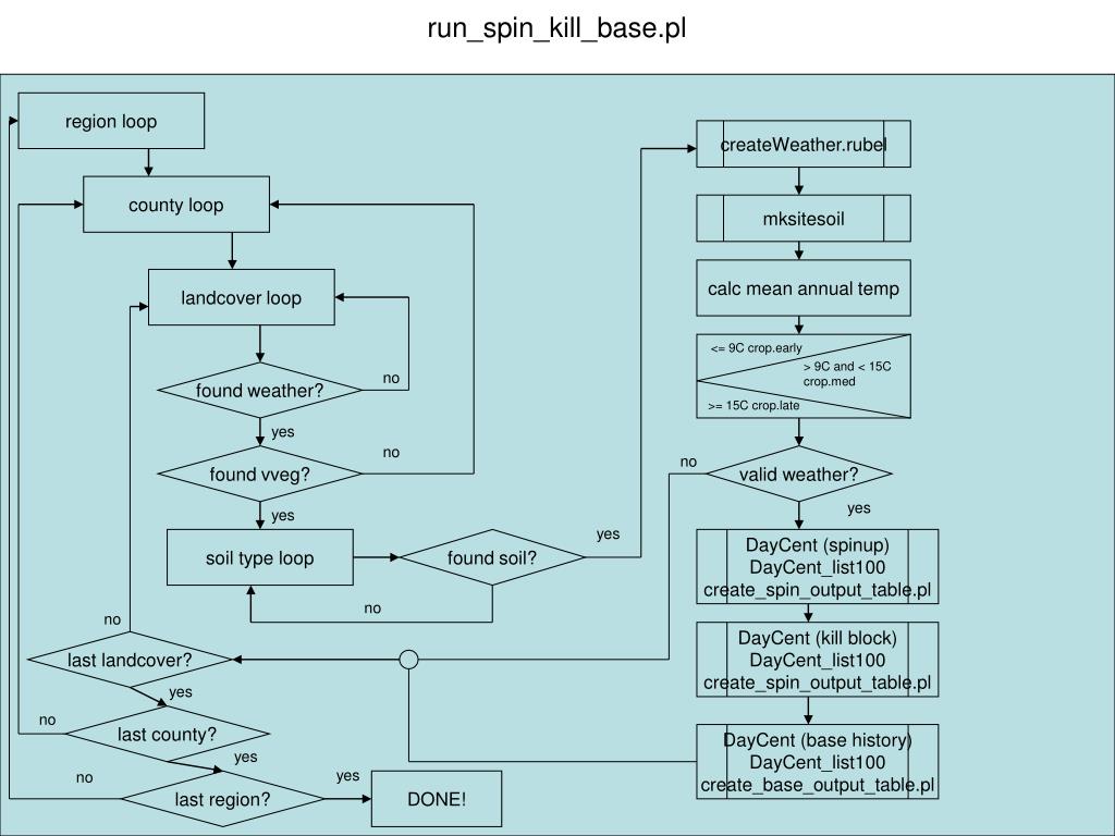 run_spin_kill_base.pl region loop createWeather.rubel county loop mksitesoil calc mean annual temp landcover loop <= 9C crop.early > 9C and < 15C crop.med found weather? no >= 15C crop.late yes no found vveg? no valid weather? yes yes yes soil type loop found soil? DayCent (spinup) DayCent_list100 create_spin_output_table.pl no no DayCent (kill block) DayCent_list100 create_spin_output_table.pl last landcover? yes no last county? DayCent (base history) DayCent_list100 create_base_output_table.pl yes yes no last region? DONE!
