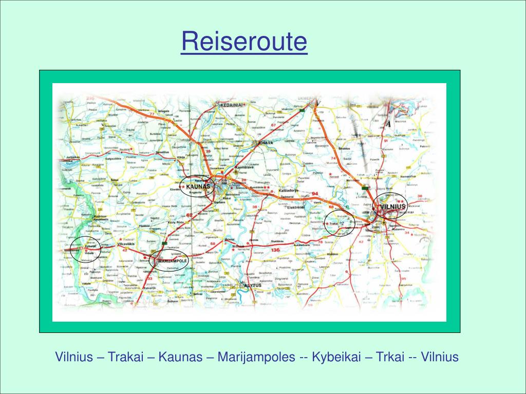 Reiseroute Vilnius – Trakai – Kaunas – Marijampoles -- Kybeikai – Trkai -- Vilnius