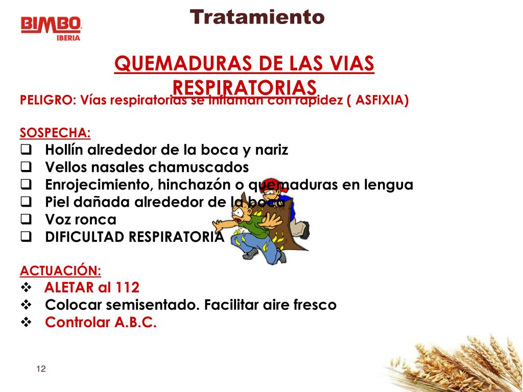 Tratamiento QUEMADURAS DE LAS VIAS RESPIRATORIAS • PELIGRO: Vías respiratorias se inflaman con rapidez ( ASFIXIA) • SOSPECHA: • Hollín alrededor de la boca y nariz • Vellos nasales chamuscados • Enrojecimiento, hinchazón o quemaduras en lengua • Piel dañada alrededor de la boca • Voz ronca • DIFICULTAD RESPIRATORIA • ACTUACIÓN: • ALETAR al 112 • Colocar semisentado. Facilitar aire fresco • Controlar A.B.C.