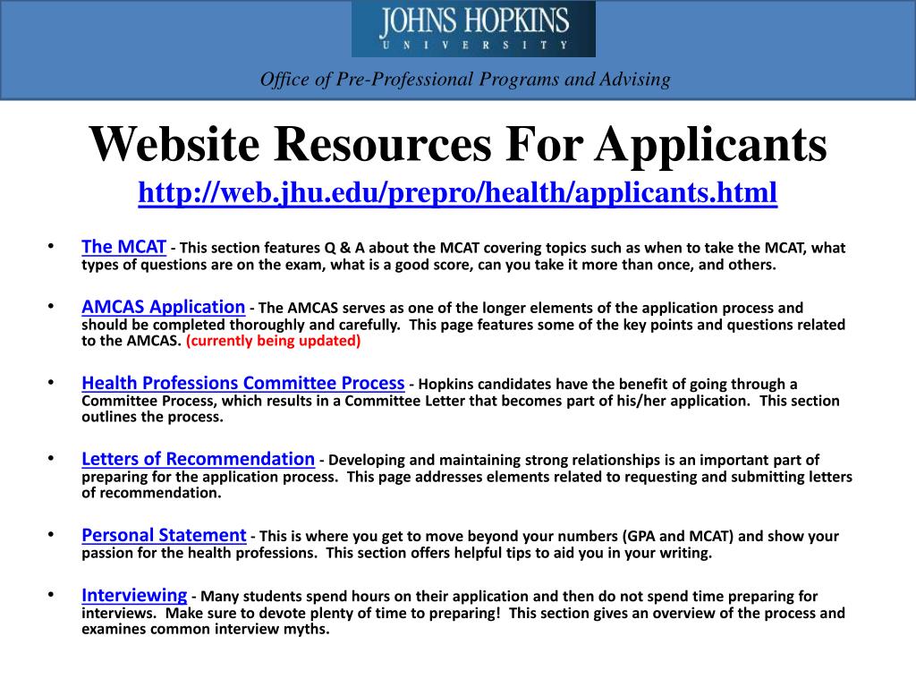 Website Resources For Applicantshttp://web.jhu.edu/prepro/health/applicants.html Office of Pre-Professional Programs and Advising • The MCAT - This section features Q & A about the MCAT covering topics such as when to take the MCAT, what types of questions are on the exam, what is a good score, can you take it more than once, and others. • AMCAS Application - The AMCAS serves as one of the longer elements of the application process and should be completed thoroughly and carefully. This page features some of the key points and questions related to the AMCAS. (currently being updated) • Health Professions Committee Process - Hopkins candidates have the benefit of going through a Committee Process, which results in a Committee Letter that becomes part of his/her application. This section outlines the process. • Letters of Recommendation - Developing and maintaining strong relationships is an important part of preparing for the application process. This page addresses elements related to requesting and submitting letters of recommendation. • Personal Statement - This is where you get to move beyond your numbers (GPA and MCAT) and show your passion for the health professions. This section offers helpful tips to aid you in your writing. • Interviewing - Many students spend hours on their application and then do not spend time preparing for interviews. Make sure to devote plenty of time to preparing! This section gives an overview of the process and examines common interview myths.