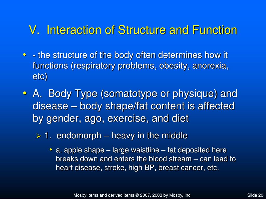 V. Interaction of Structure and Function • - the structure of the body often determines how it functions (respiratory problems, obesity, anorexia, etc) • A. Body Type (somatotype or physique) and disease – body shape/fat content is affected by gender, ago, exercise, and diet • 1. endomorph – heavy in the middle • a. apple shape – large waistline – fat deposited here breaks down and enters the blood stream – can lead to heart disease, stroke, high BP, breast cancer, etc.