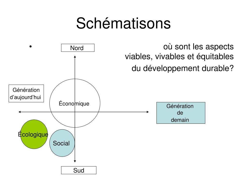Schématisons • où sont les aspects viables, vivables et équitables du développement durable? Nord Économique Génération d’aujourd’hui Génération de demain Écologique Social Sud