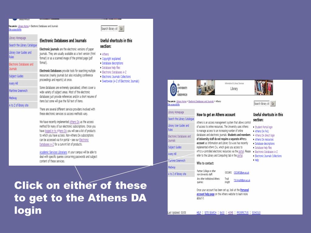 Go to the Library & Computing tab on the portal then Click on Databases & Journals or (via Athens DA)