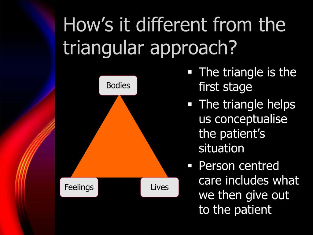 How’s it different from the triangular approach? • The triangle is the first stage • The triangle helps us conceptualise the patient’s situation • Person centred care includes what we then give out to the patient