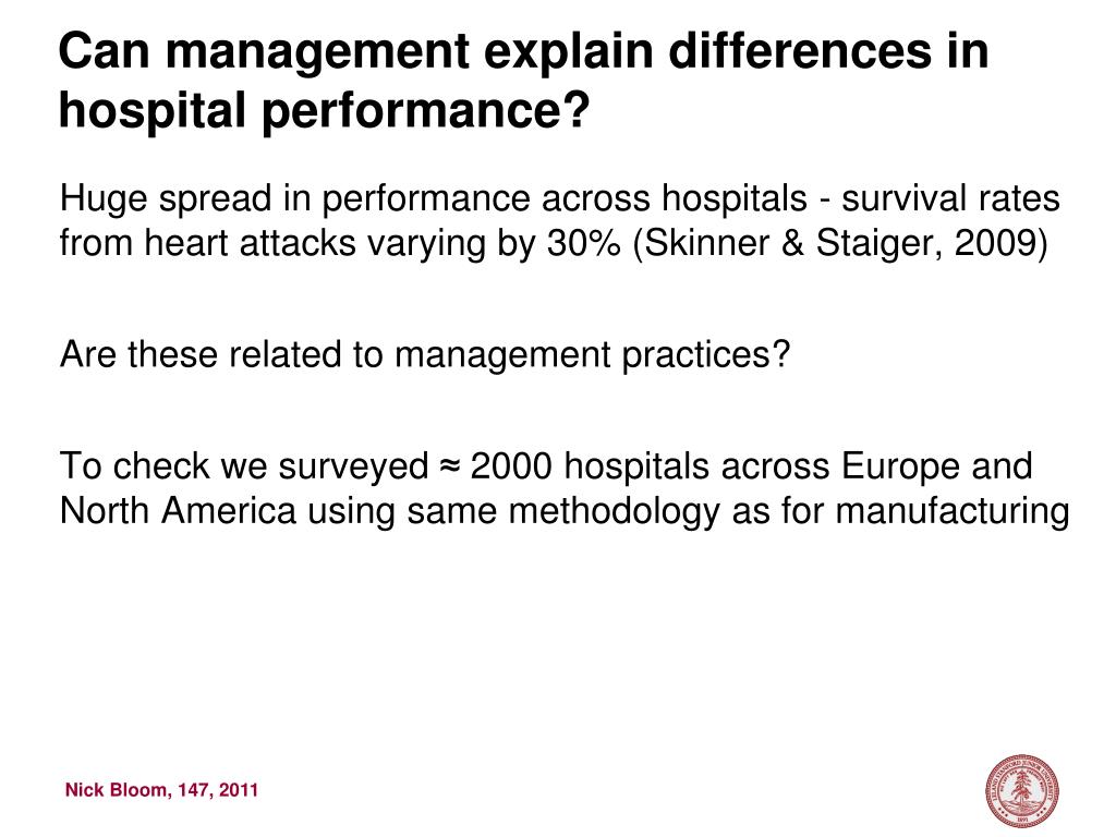 Huge spread in performance across hospitals - survival rates from heart attacks varying by 30% (Skinner & Staiger, 2009) Are these related to management practices? To check we surveyed ≈ 2000 hospitals across Europe and North America using same methodology as for manufacturing Can management explain differences in hospital performance?