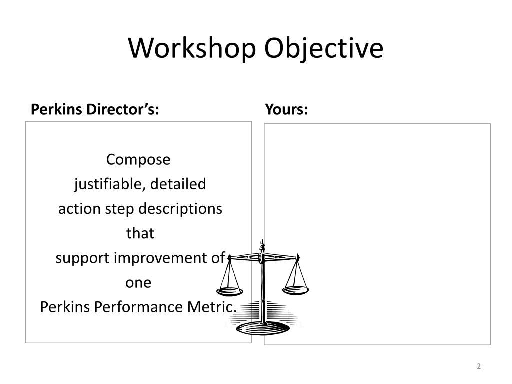 Workshop Objective Perkins Director’s: Yours: Compose justifiable, detailed action step descriptions that support improvement of one Perkins Performance Metric.