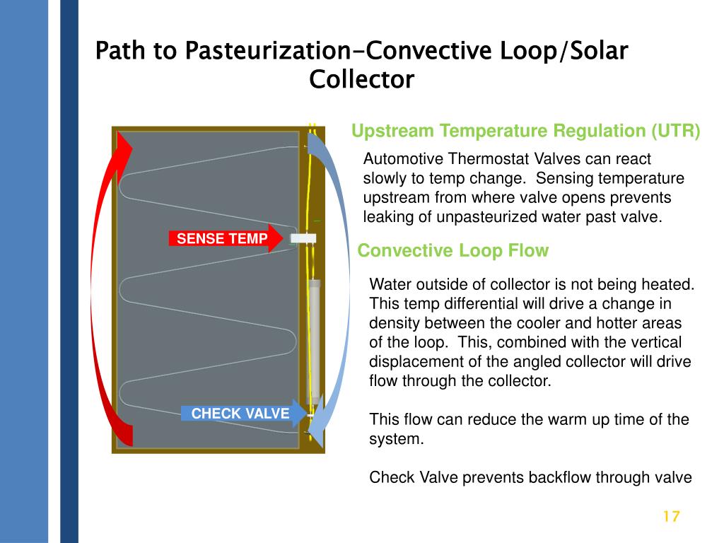 Path to Pasteurization-Convective Loop/Solar Collector Upstream Temperature Regulation (UTR) Automotive Thermostat Valves can react slowly to temp change. Sensing temperature upstream from where valve opens prevents leaking of unpasteurized water past valve. SENSE TEMP Convective Loop Flow Water outside of collector is not being heated. This temp differential will drive a change in density between the cooler and hotter areas of the loop. This, combined with the vertical displacement of the angled collector will drive flow through the collector. This flow can reduce the warm up time of the system. Check Valve prevents backflow through valve CHECK VALVE