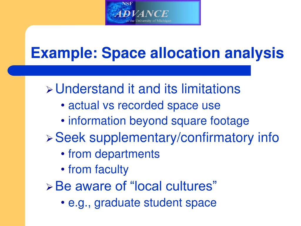 Example: Space allocation analysis • Understand it and its limitations • actual vs recorded space use • information beyond square footage • Seek supplementary/confirmatory info • from departments • from faculty • Be aware of “local cultures” • e.g., graduate student space