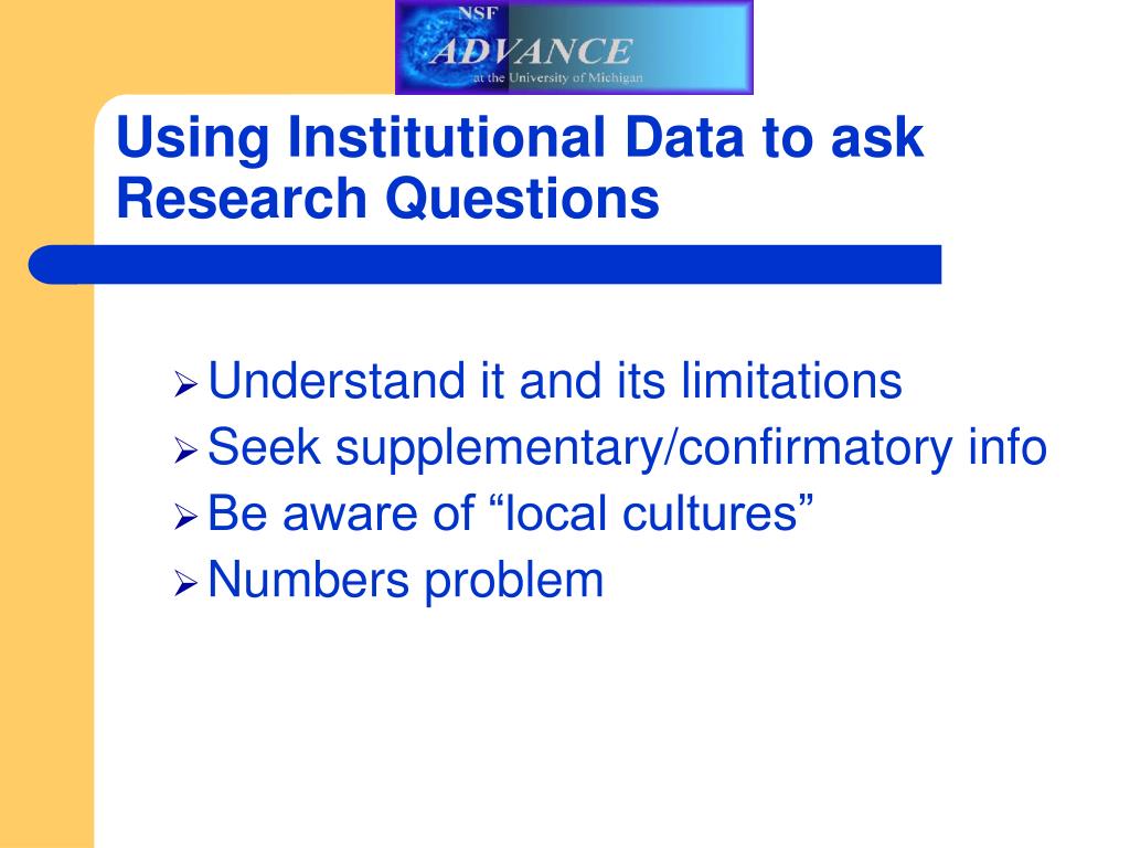 Using Institutional Data to ask Research Questions • Understand it and its limitations • Seek supplementary/confirmatory info • Be aware of “local cultures” • Numbers problem