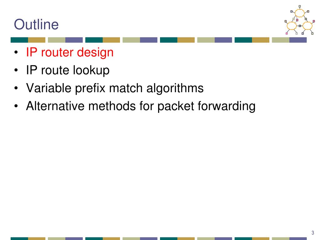 Outline • IP router design • IP route lookup • Variable prefix match algorithms • Alternative methods for packet forwarding