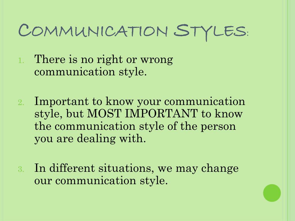 Communication. Communication Styles :. There is no right or wrong communication style . Important to know your communication style, but MOST IMPORTANT to know the communication style of the person you are dealing with . In different situations, we may change our communication style .