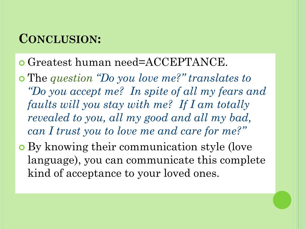Conclusion: • Greatest human need=ACCEPTANCE. • The question “Do you love me?” translates to “Do you accept me? In spite of all my fears and faults will you stay with me? If I am totally revealed to you, all my good and all my bad, can I trust you to love me and care for me?” • By knowing their communication style (love language), you can communicate this complete kind of acceptance to your loved ones.