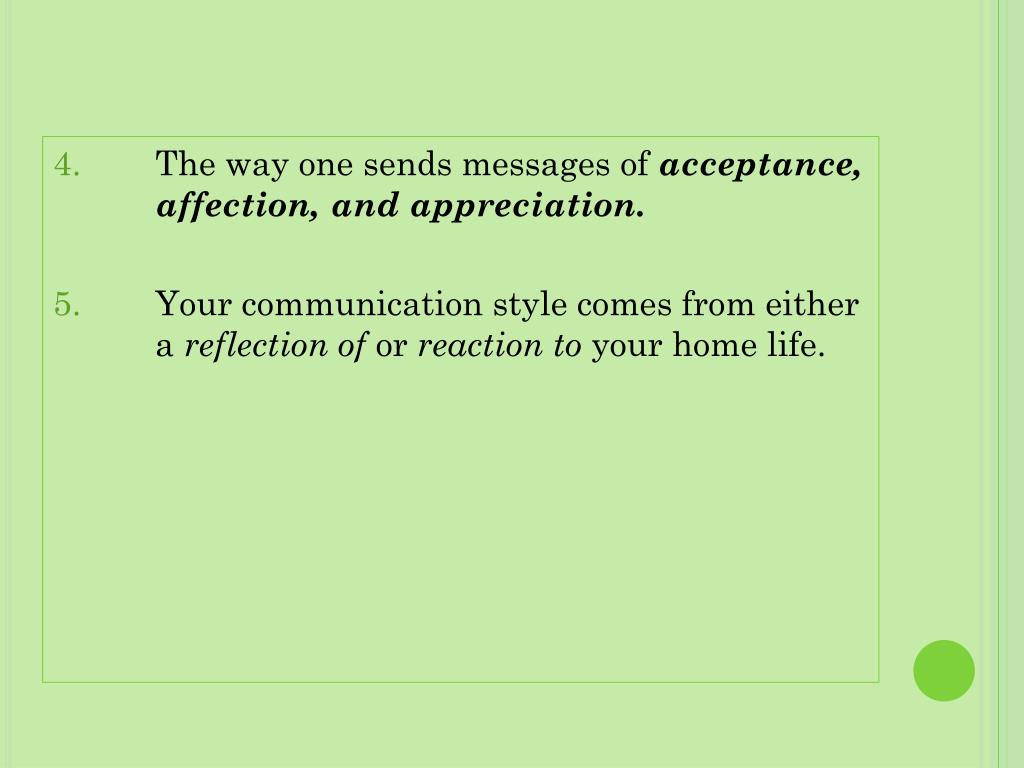 4. The way one sends messages of acceptance, affection, and appreciation. 5. Your communication style comes from either a reflection of or reaction to your home life.