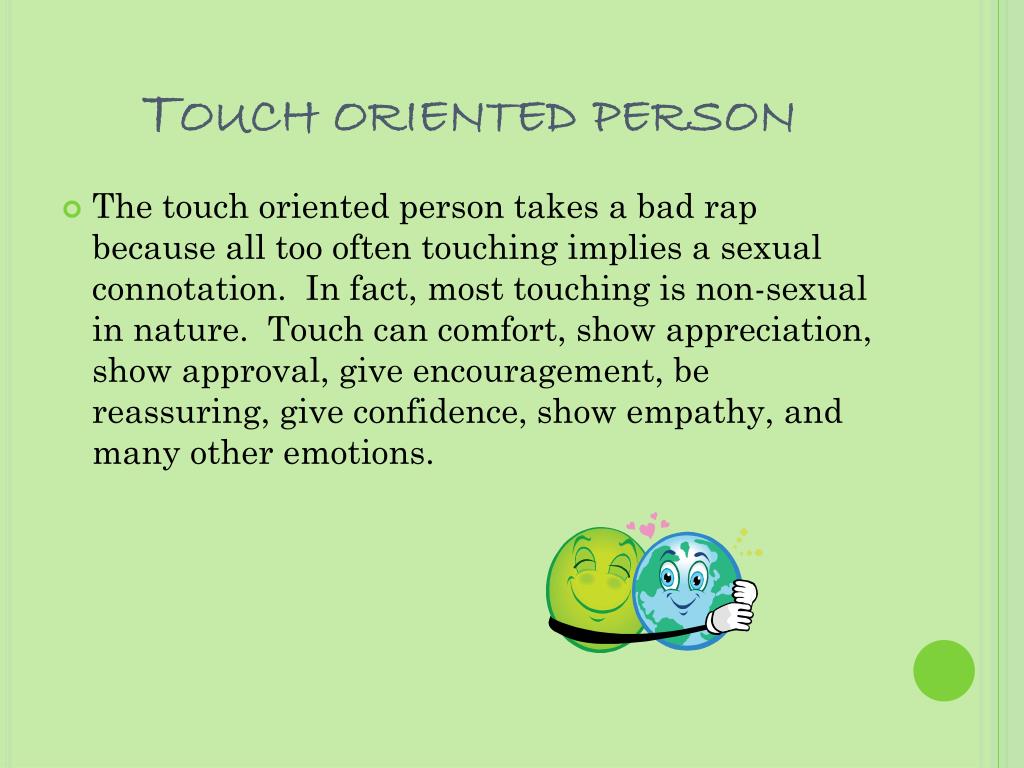 Touch oriented person • The touch oriented person takes a bad rap because all too often touching implies a sexual connotation. In fact, most touching is non-sexual in nature. Touch can comfort, show appreciation, show approval, give encouragement, be reassuring, give confidence, show empathy, and many other emotions.