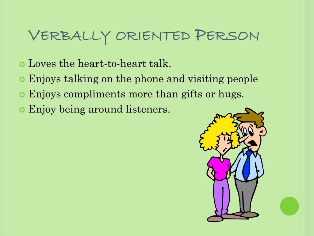 Verbally oriented Person • Loves the heart-to-heart talk. • Enjoys talking on the phone and visiting people • Enjoys compliments more than gifts or hugs. • Enjoy being around listeners.