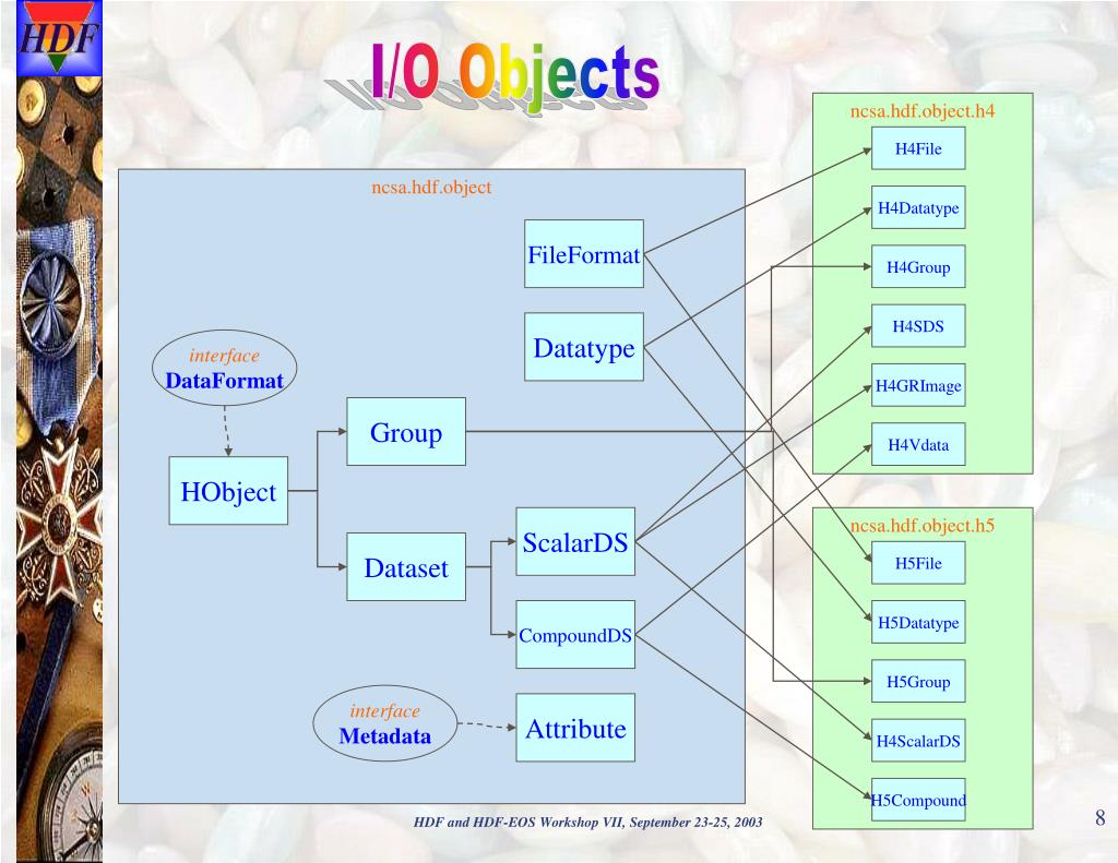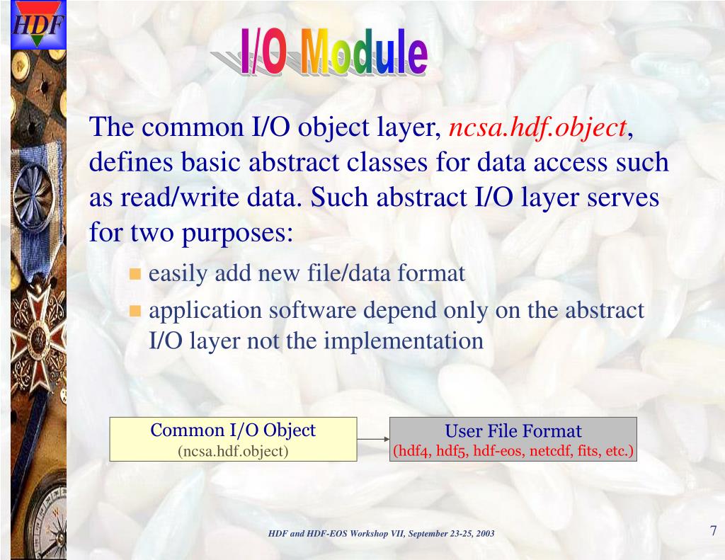 I/O Module The common I/O object layer, ncsa.hdf.object, defines basic abstract classes for data access such as read/write data. Such abstract I/O layer serves for two purposes: • easily add new file/data format • application software depend only on the abstract I/O layer not the implementation Common I/O Object (ncsa.hdf.object) User File Format (hdf4, hdf5, hdf-eos, netcdf, fits, etc.) HDF and HDF-EOS Workshop VII, September 23-25, 2003