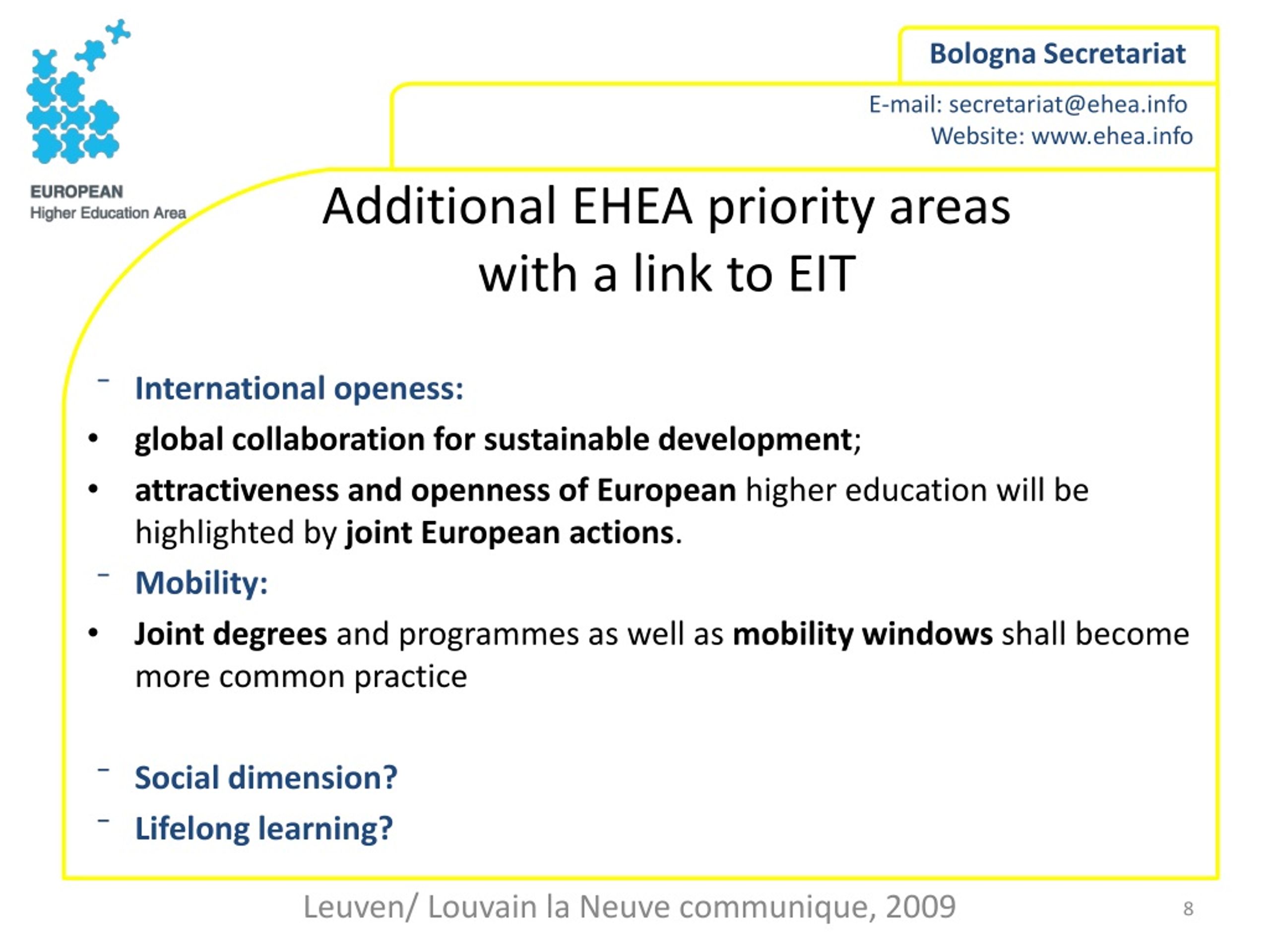Additional EHEA priority areas with a link to EIT • Employability: • With labour markets increasingly relying on higher skill levels and transversal competences, higher education should equip students with the advanced knowledge, skills and competences they need throughout their professional lives; • Employability empowers the individual to fully seize the opportunities in changing labour markets; • work placements embedded in study programmes as well as on-the-job learning. Leuven/ Louvain la Neuve communique, 2009