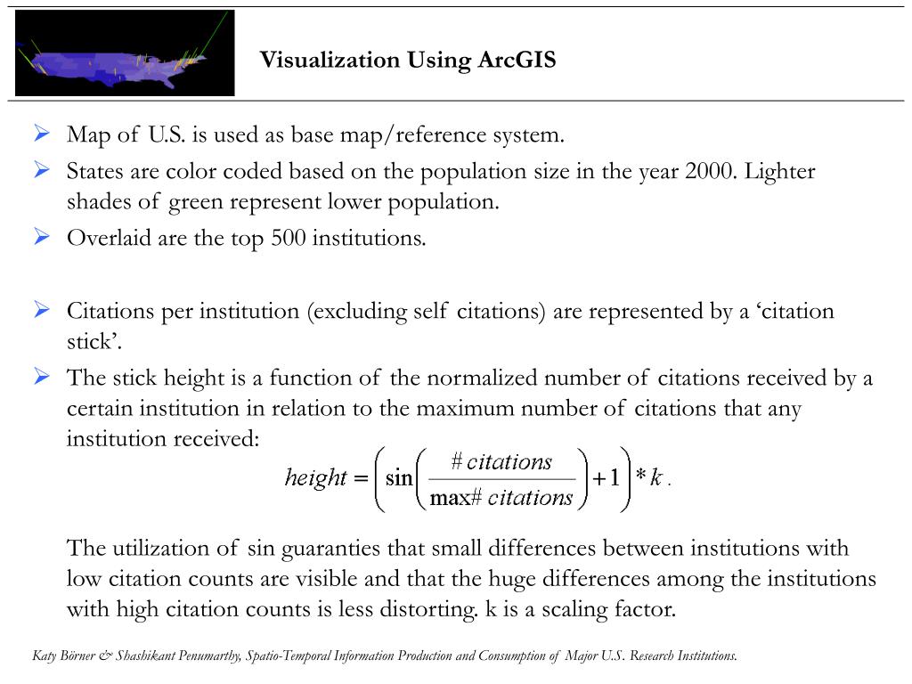 Visualization Using ArcGIS • Map of U.S. is used as base map/reference system. • States are color coded based on the population size in the year 2000. Lighter shades of green represent lower population. • Overlaid are the top 500 institutions. • Citations per institution (excluding self citations) are represented by a ‘citation stick’. • The stick height is a function of the normalized number of citations received by a certain institution in relation to the maximum number of citations that any institution received: The utilization of sin guaranties that small differences between institutions with low citation counts are visible and that the huge differences among the institutions with high citation counts is less distorting. k is a scaling factor. Katy Börner & Shashikant Penumarthy, Spatio-Temporal Information Production and Consumption of Major U.S. Research Institutions.