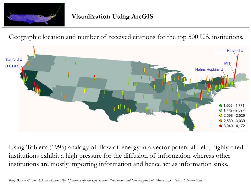 Visualization Using ArcGIS Geographic location and number of received citations for the top 500 U.S. institutions. Using Tobler’s (1995) analogy of flow of energy in a vector potential field, highly cited institutions exhibit a high pressure for the diffusion of information whereas other institutions are mostly importing information and hence act as information sinks. Katy Börner & Shashikant Penumarthy, Spatio-Temporal Information Production and Consumption of Major U.S. Research Institutions.