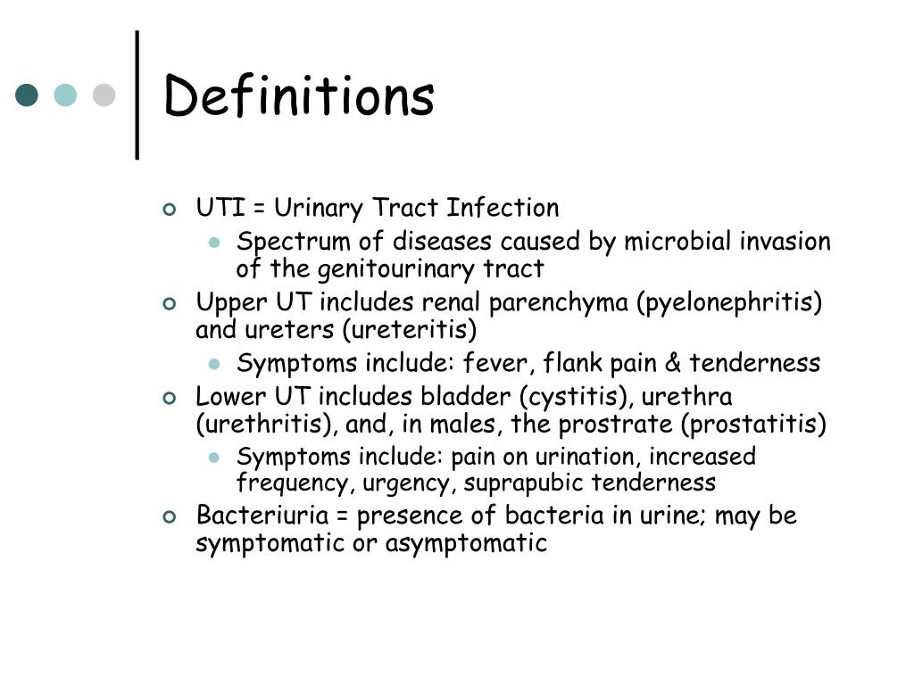 Definitions • UTI = Urinary Tract Infection • Spectrum of diseases caused by microbial invasion of the genitourinary tract • Upper UT includes renal parenchyma (pyelonephritis) and ureters (ureteritis) • Symptoms include: fever, flank pain & tenderness • Lower UT includes bladder (cystitis), urethra (urethritis), and, in males, the prostrate (prostatitis) • Symptoms include: pain on urination, increased frequency, urgency, suprapubic tenderness • Bacteriuria = presence of bacteria in urine; may be symptomatic or asymptomatic