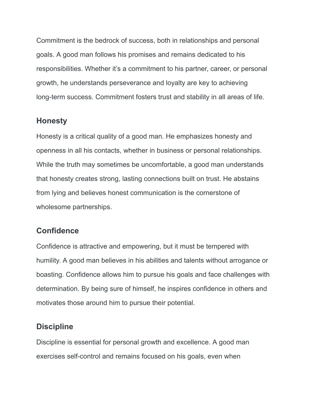 Commitment is the bedrock of success, both in relationships and personal goals. A good man follows his promises and remains dedicated to his responsibilities. Whether it’s a commitment to his partner, career, or personal growth, he understands perseverance and loyalty are key to achieving long-term success. Commitment fosters trust and stability in all areas of life. Honesty Honesty is a critical quality of a good man. He emphasizes honesty and openness in all his contacts, whether in business or personal relationships. While the truth may sometimes be uncomfortable, a good man understands that honesty creates strong, lasting connections built on trust. He abstains from lying and believes honest communication is the cornerstone of wholesome partnerships. Confidence Confidence is attractive and empowering, but it must be tempered with humility. A good man believes in his abilities and talents without arrogance or boasting. Confidence allows him to pursue his goals and face challenges with determination. By being sure of himself, he inspires confidence in others and motivates those around him to pursue their potential. Discipline Discipline is essential for personal growth and excellence. A good man exercises self-control and remains focused on his goals, even when