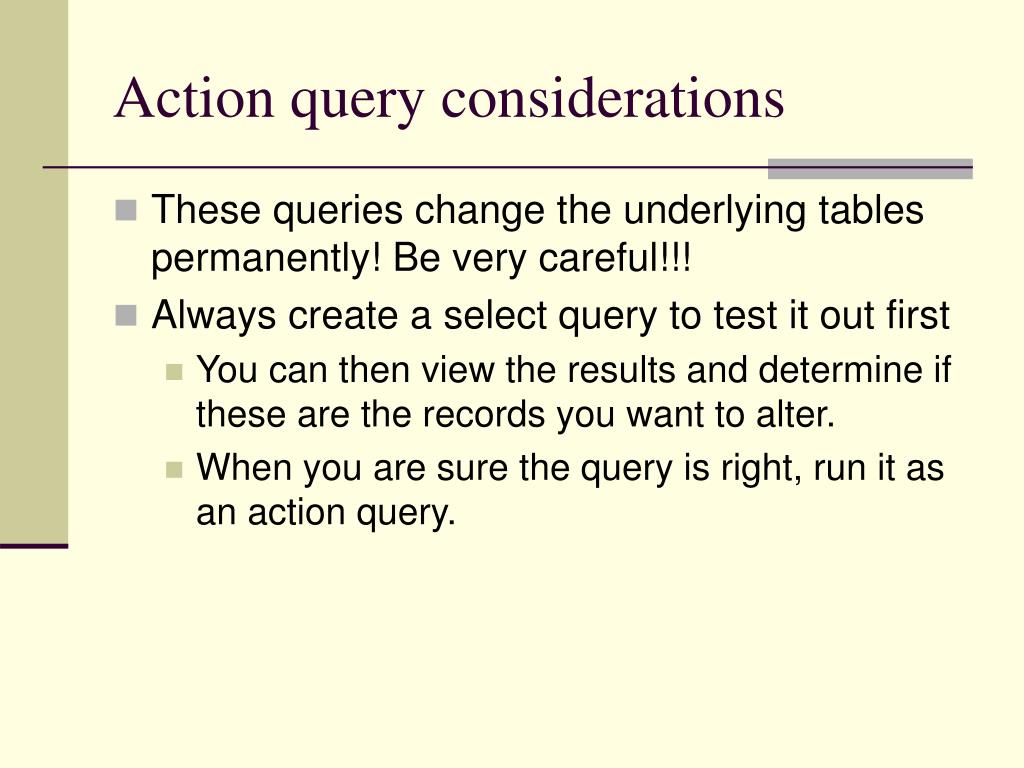 Action query considerations • These queries change the underlying tables permanently! Be very careful!!! • Always create a select query to test it out first • You can then view the results and determine if these are the records you want to alter. • When you are sure the query is right, run it as an action query.