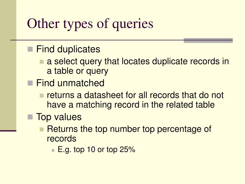 Other types of queries • Find duplicates • a select query that locates duplicate records in a table or query • Find unmatched • returns a datasheet for all records that do not have a matching record in the related table • Top values • Returns the top number top percentage of records • E.g. top 10 or top 25%