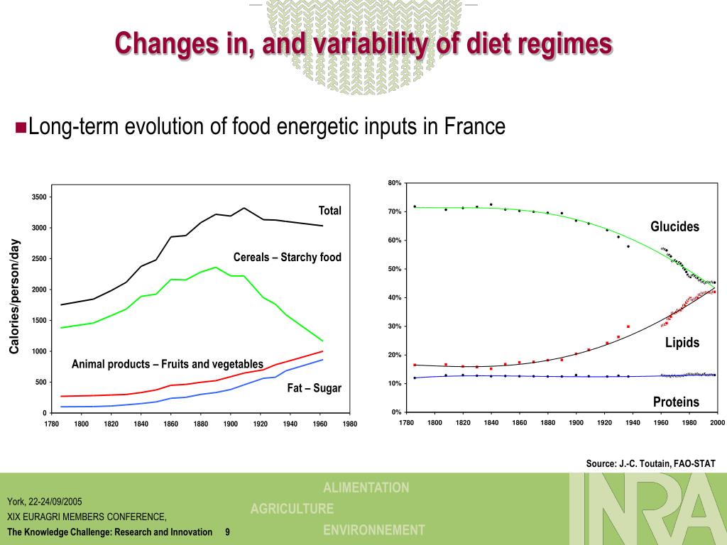 Changes in, and variability of diet regimes • Long-term evolution of food energetic inputs in France Total Glucides Cereals – Starchy food Calories/person/day Lipids Animal products – Fruits and vegetables Fat – Sugar Proteins Source: J.-C. Toutain, FAO-STAT