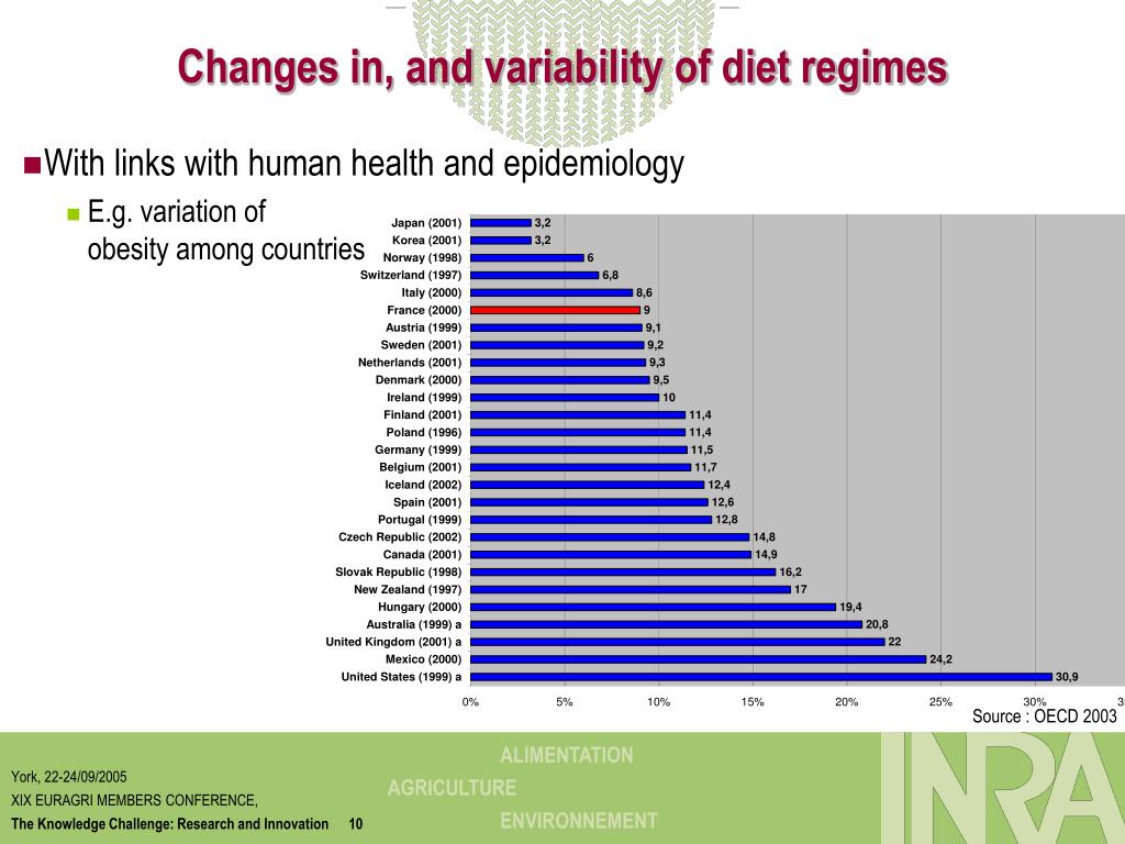 Changes in, and variability of diet regimes • With links with human health and epidemiology • E.g. variation ofobesity among countries Source : OECD 2003