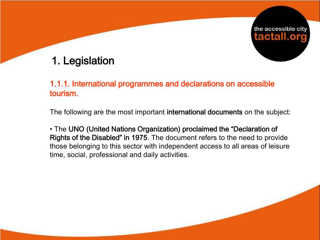 1. Legislation 1.1.1. International programmes and declarations on accessible tourism. The following are the most important international documents on the subject: • The UNO (United Nations Organization)proclaimed the “Declaration of Rights of the Disabled” in 1975. The document refers to the need to provide those belonging to this sector with independent access to all areas of leisure time, social, professional and daily activities.