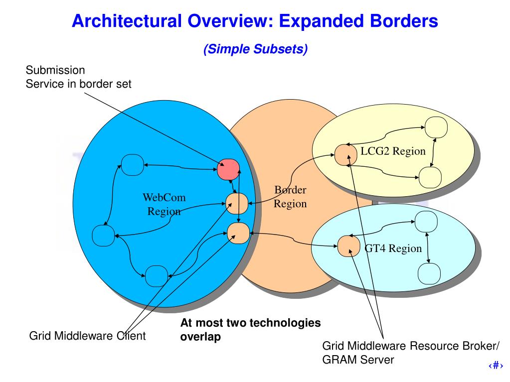 Architectural Overview: Collapsed Borders for LCG2(More complex Subsets) Only two technologies overlap in the simple border subset WebCom Region Border Region LCG2 Region All three technologies overlap in the collapsed border subset