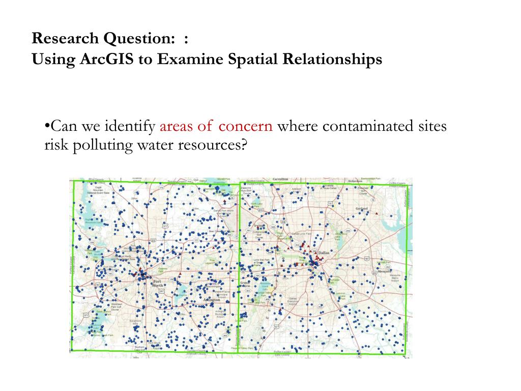 Research Question: :Using ArcGIS to Examine Spatial Relationships • Can we identify areas of concern where contaminated sites risk polluting water resources?