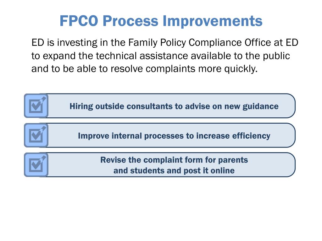 FPCO Process Improvements ED is investing in the Family Policy Compliance Office at ED to expand the technical assistance available to the public and to be able to resolve complaints more quickly. Hiring outside consultants to advise on new guidance Improve internal processes to increase efficiency Revise the complaint form for parents and students and post it online