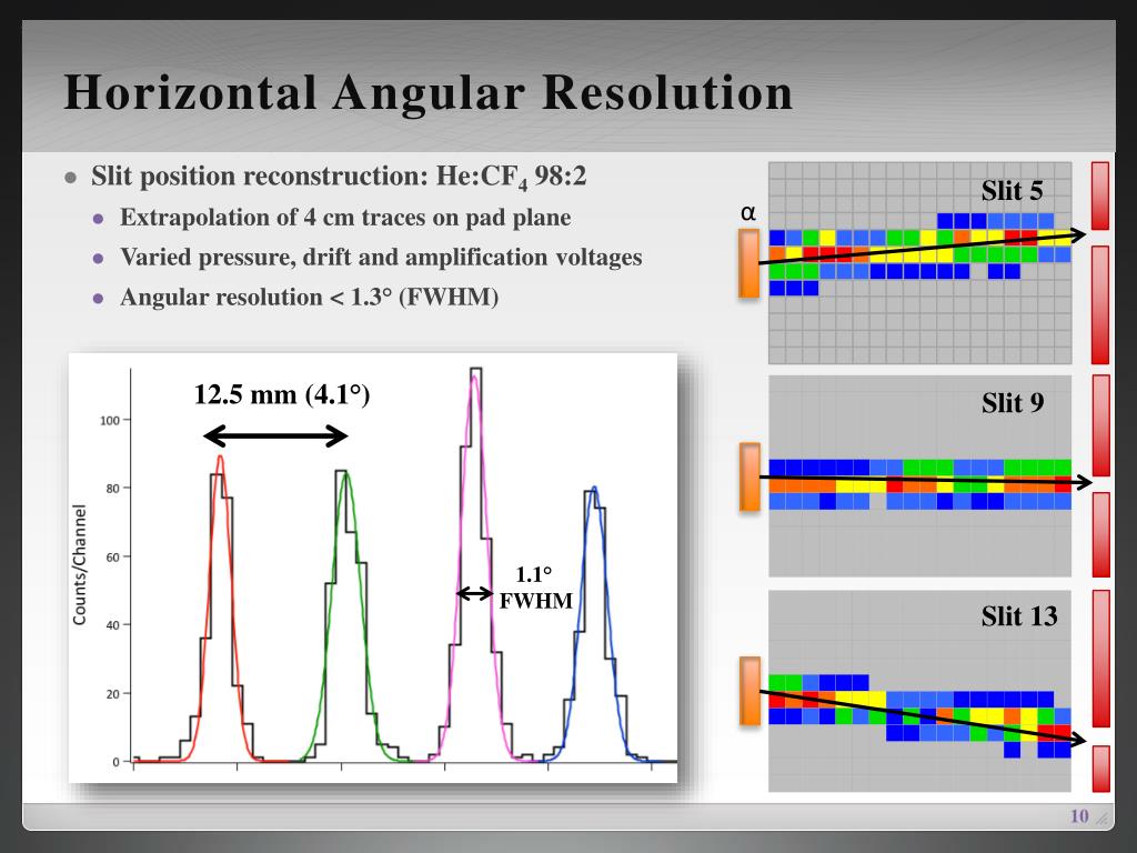Horizontal Angular Resolution • Slit position reconstruction: He:CF4 98:2 • Extrapolation of 4 cm traces on pad plane • Varied pressure, drift and amplification voltages • Angular resolution < 1.3° (FWHM) Slit 5 α 12.5 mm (4.1°) Slit 9 1.1° FWHM Slit 13
