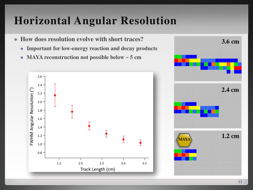 Horizontal Angular Resolution • How does resolution evolve with short traces? • Important for low-energy reaction and decay products • MAYA reconstruction not possible below ~ 5 cm 3.6 cm 2.4 cm 1.2 cm MAYA